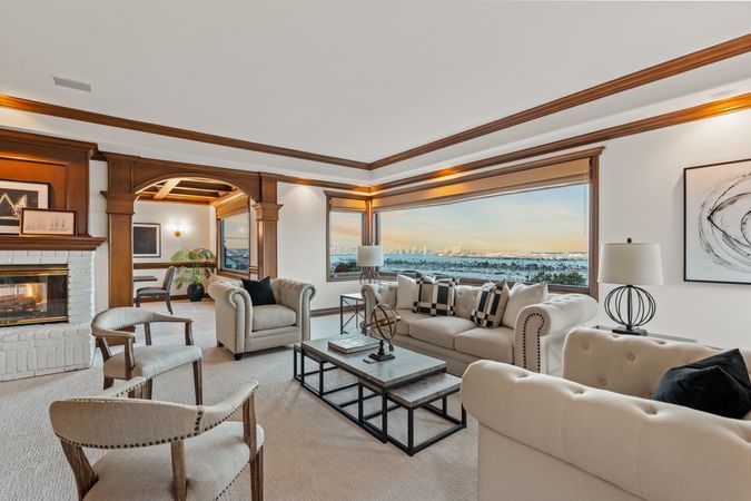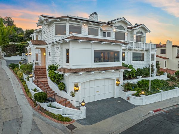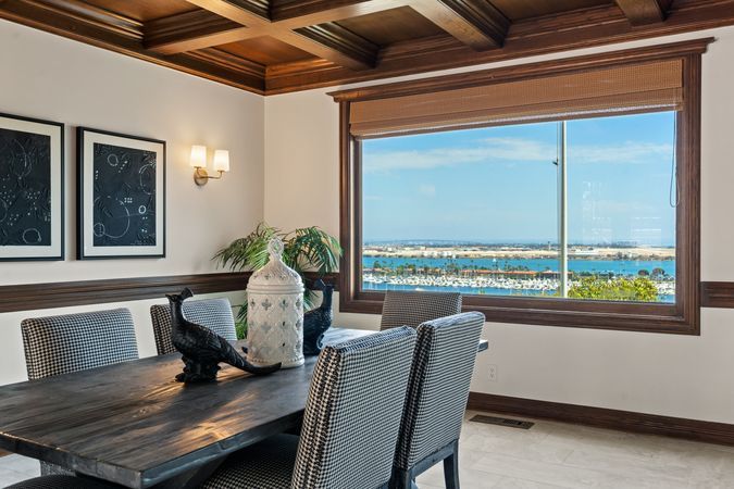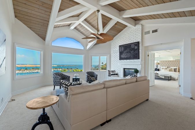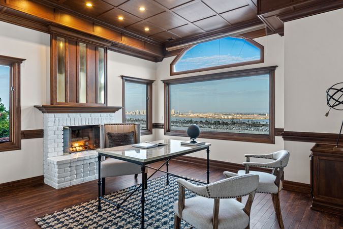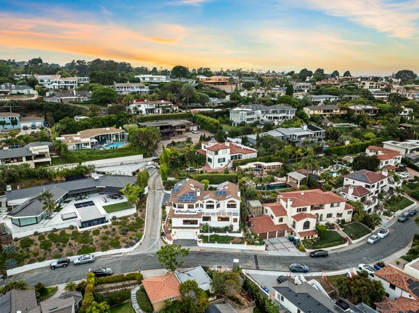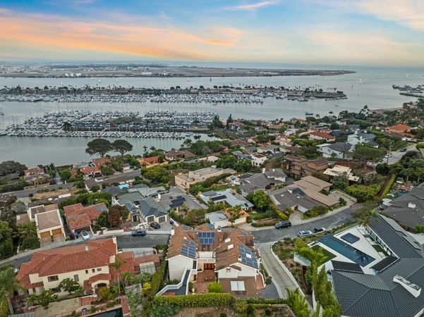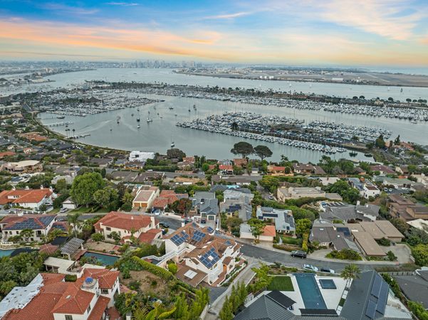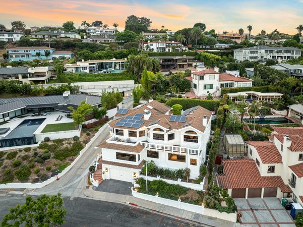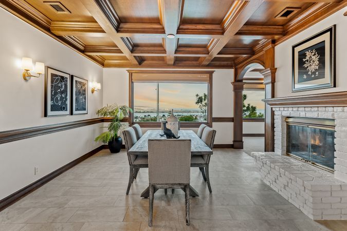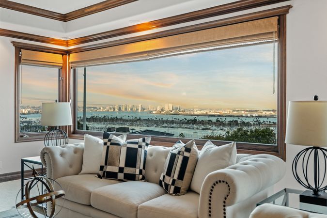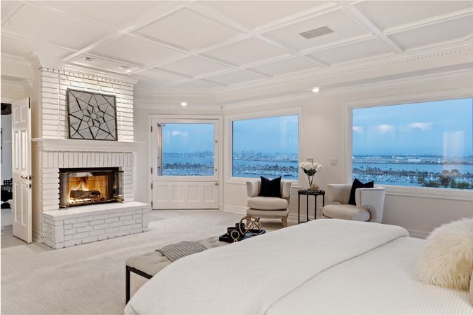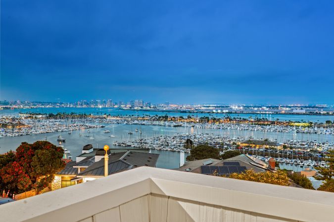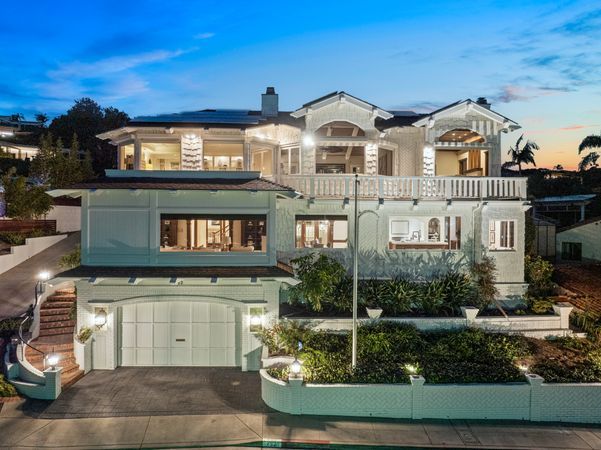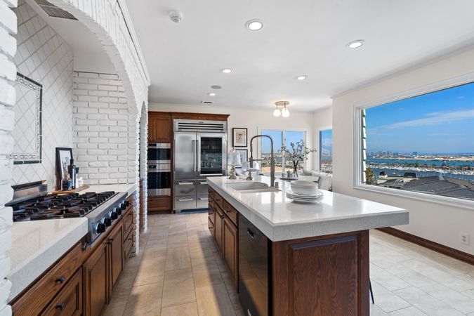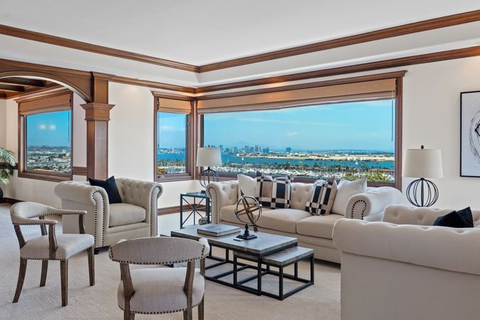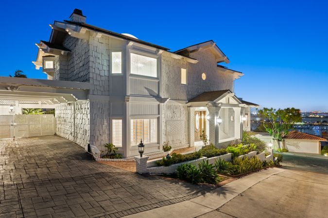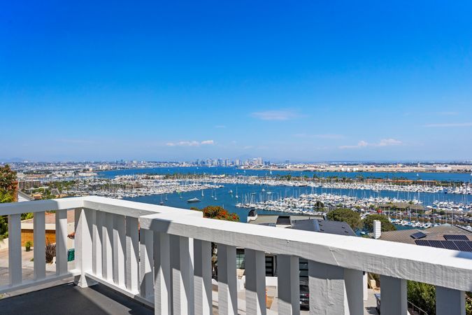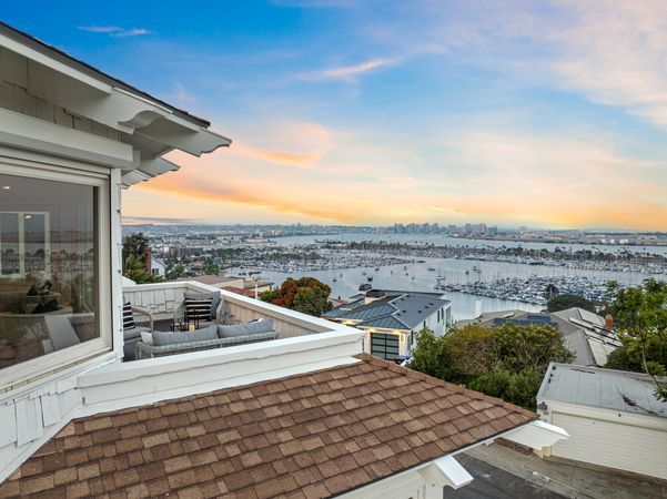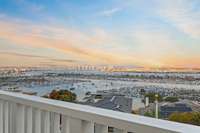 Experience breathtaking panoramic views that rank among the very best in Southern California. This sophisticated and elegant home is perfectly situated on a cul-de-sac in the scenic hills of Point Loma. The spacious living areas are accentuated by four fireplaces, creating a warm and inviting atmosphere. The gourmet kitchen, equipped with a Sub-Zero Pro series refrigerator, six burner Viking gas cooktop, and Wolf dual ovens, is perfect for the culinary enthusiast. Two entry-level and two upstairs bedrooms are all generously proportioned and designed to maximize privacy. An upper-level view office is ideal for working from home and to take in the ever-changing scene unfolding outside the large windows. The five-and-a-half bathrooms include a recently remodeled primary bath fit for royalty. Dual sinks with Dyson faucets / hand dryers, two private smart toilets, a steam shower, and a luxurious soaking tub complete the spa-like retreat. The home is designed to maximize the stunning views, with large windows in nearly every room that frame the picturesque scenery of the San Diego Bay, downtown skyline, Coronado, Mexico, and the Pacific. The expansive front and rear decks provide the perfect setting for outdoor entertaining or simply enjoying the mesmerizing views. This estate spans over 4,400 square feet of living space on an estimated 8,190-square-foot lot, providing ample space for both relaxation and entertainment. Don't miss the rare opportunity to own this exceptional Point Loma residence with unrivaled views!